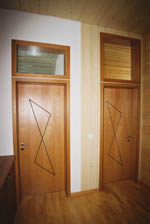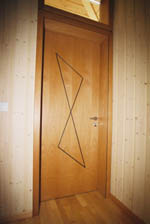 Buche gedämpft furniert mit X-förmiger Ausfräsung - dort kommt die untenliegende schwarze MDF-Platte zum Vorschein